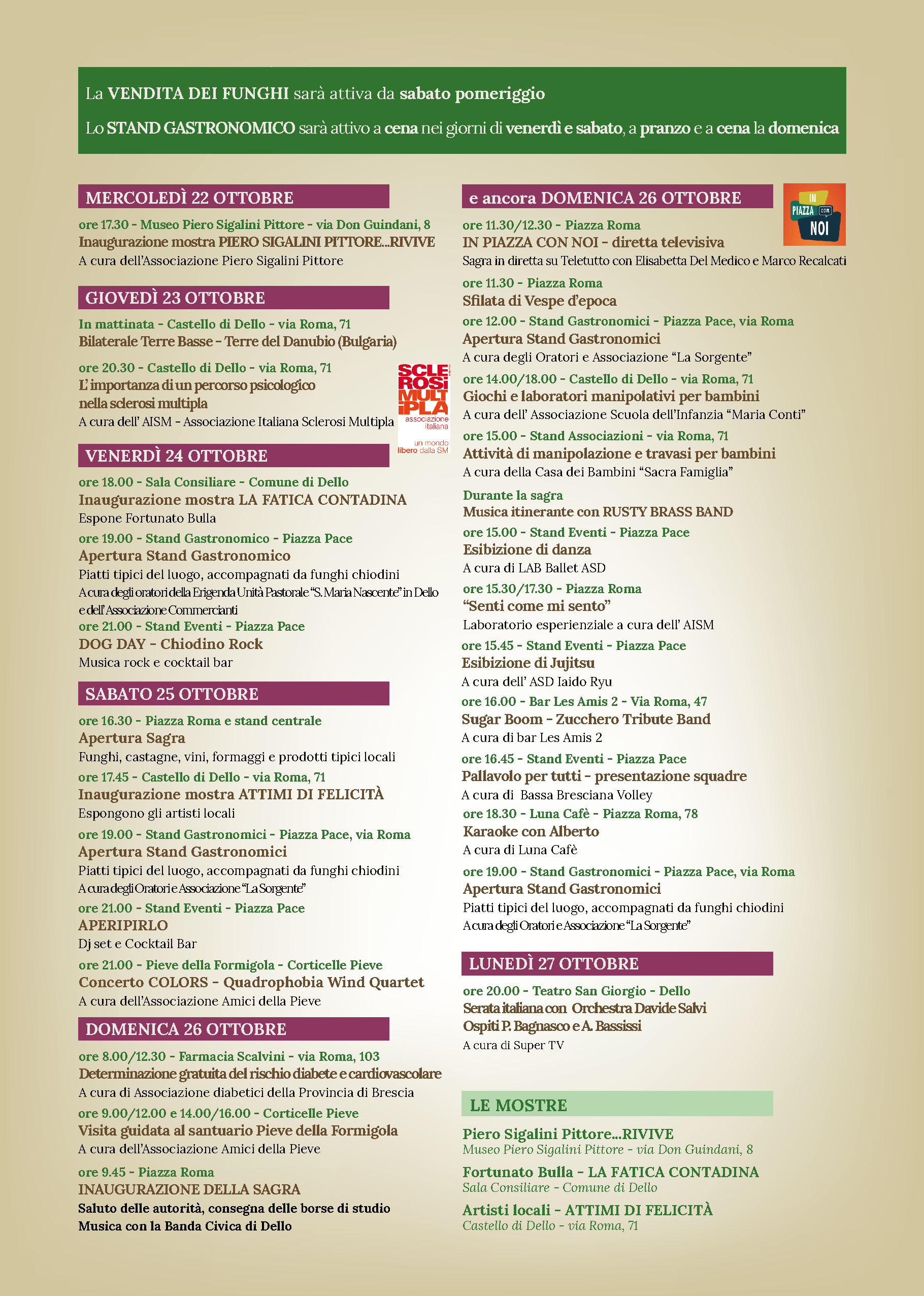 - mercoledì 22 ore 17.30 - Inaugurazione mostra "PIERO SIGALINI PITTORE... RIVIVE" (A cura dell'Associazione P. Sigalini Pittore - Museo Sigalini, Via don Guindani)