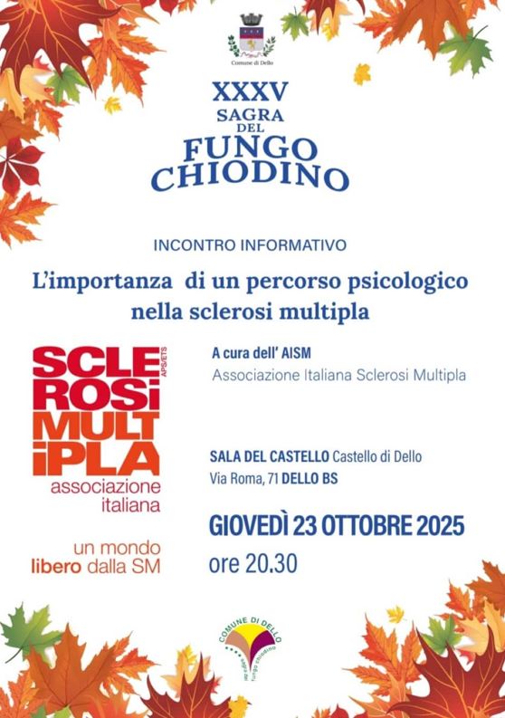 - giovedì 23 ore 20.30 - Incontro "L'IMPORTANZA DI UN PERCORSO PSICOLOGICO NELLA SCLEROSI MULTIPLA" (A cura dell'AISM Associazione Italiana Sclerosi Multipla - Castello di Dello, Via Roma 71)