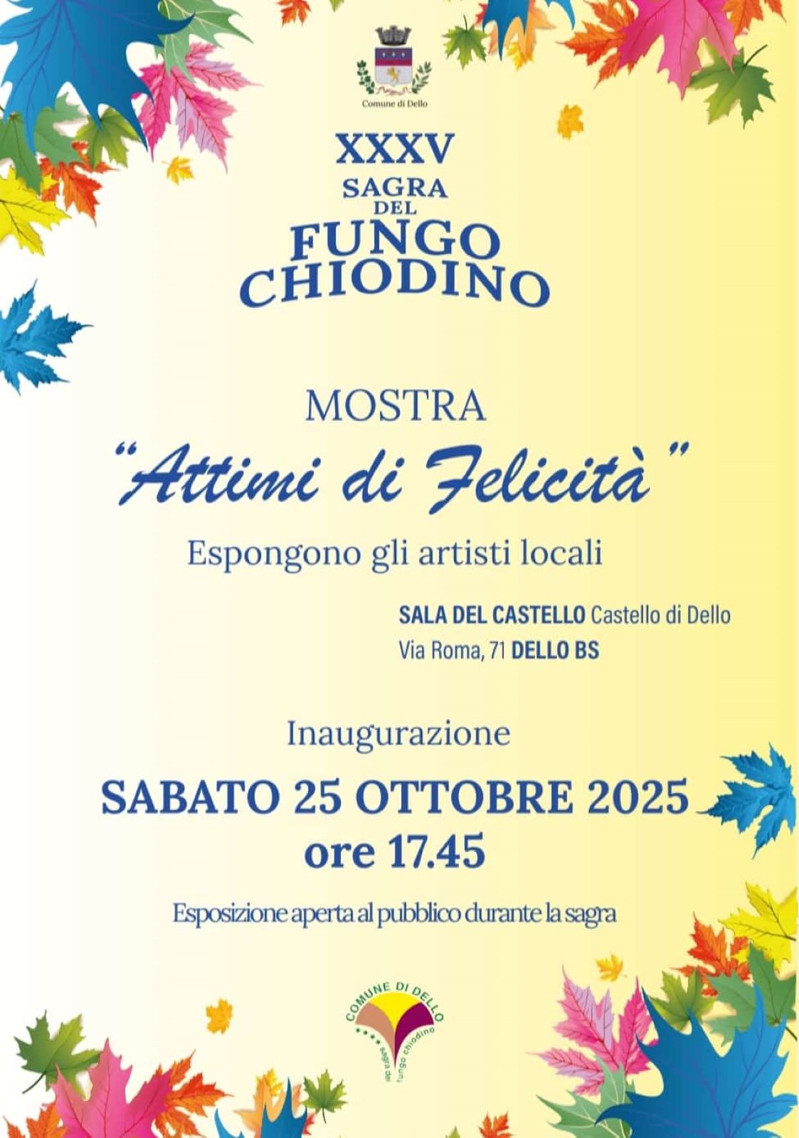 - sabato 25 ore 17.45 - Inaugurazione mostra "ATTIMI DI FELICITA'" (Espongono gli artisti locali - Castello di Dello, Via Roma 71)