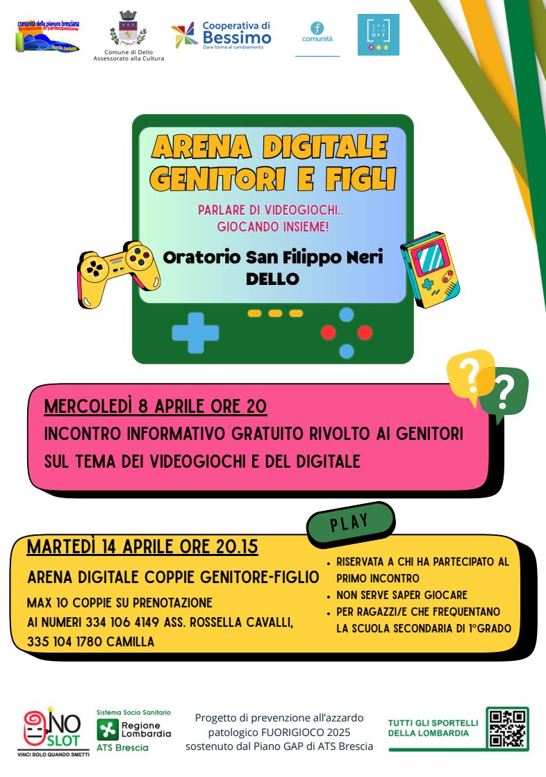 L'arena digitale è uno spazio di condivisione e divertimento nella coppia genitori figli. L'obiettivo è quello di creare un ponte comunicativo fra genitori e figli attraverso l'attività videoludica: grazie all’esperienza di gioco gli adulti possono conoscere i videogiochi come stile comunicativo nuovo che avvicina e ridimensiona il gap generazionale e allo stesso tempo anche aiutare i figli a contenere gli aspetti relazionali ed espressivi elicitati dal gioco.